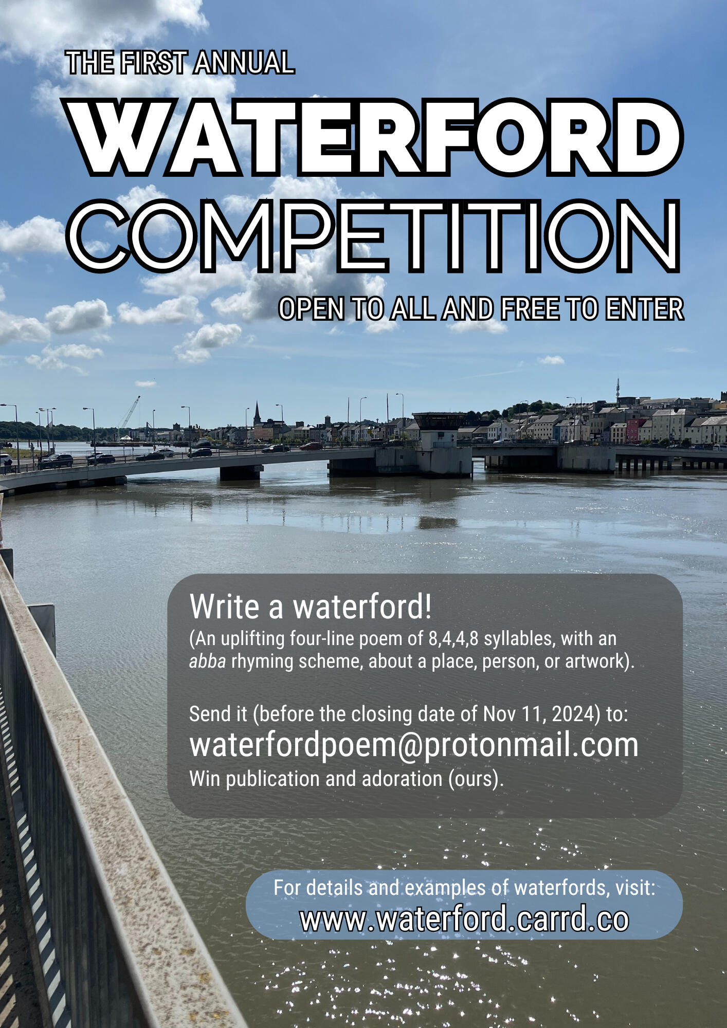 2025's waterford competition is now closed, it closed for submissions at midnight on November 15th. The competition will return in May 2026, but the waterford has a new home - so visit waterfordrhyme.com, or follow us on BlueSky for more information.In 2025, as in 2024, the contest was just for fun and bragging rights, but in 2026 we will be upping the ante, with a dedicated winners event, commemorative awards, and a cash prize. OK, it'll be a modest cash prize, but it's real money! We'll keep you posted.Alas, there were no cash prizes in 2025, but oh joy, the evening we had at The Marine Bar in Dungarvan to round everything off was exhilerating. In 2024, nearly all of the winners joined us, in 2025 that was a little more challenging, since they came from as far afield as Pakistan and Malaysia.One development in 2025 was the presence of a guest judge. We were delighted to have the services of Alan Murphy. Alan is the author and illustrator of four books of poetry. His writings and artworks have been widely published in countless journals and anthologies. Click on his name above to visit his website, or check out his instagram page.In 2026, Alan will be a tough act to follow, but we think we've managed, by having a veritable superstar of poetry on board. As before, ten winners will be chosen, all of whom will be recognised by publication, and invited to read, but everyone who enters will win our adoration for helping establish a new, and essentially positive, art form. We desperately need more positivity in the world!The waterford, in all its glory, is the brainchild of Kevin MacAlan. For the most part, this is not a glass-half-full kind of a fella. So, let's make this positive offering to the universe a resounding celebration.C'mon, most of yers think you have a book in ye, all we're looking for is twenty-four syllables (probably less than a couple of dozen words).The only catch? You gotta say something nice!